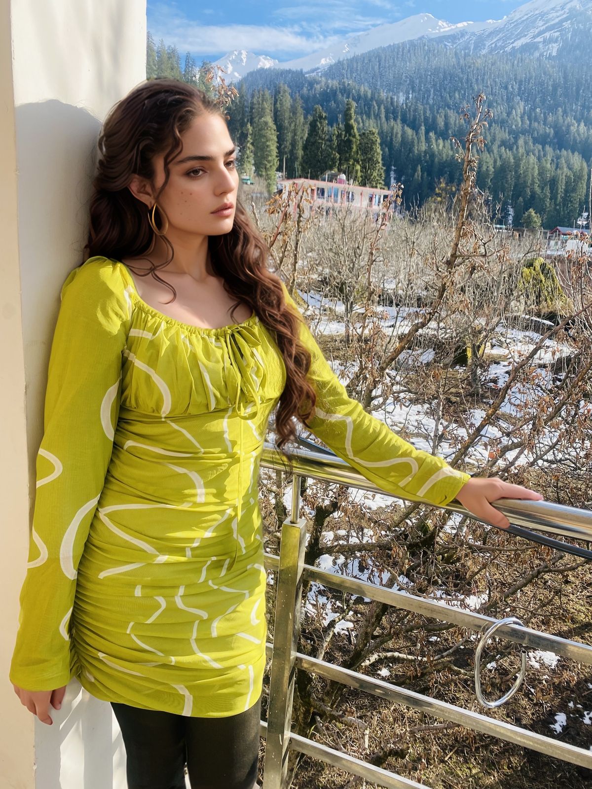 Stand out in this lime yellow rushed mesh bodycon mini dress. With sheer long sleeves, a wide square neckline, and a curve-hugging fit, it's perfect for parties, vacations, or photo-ready moments.
