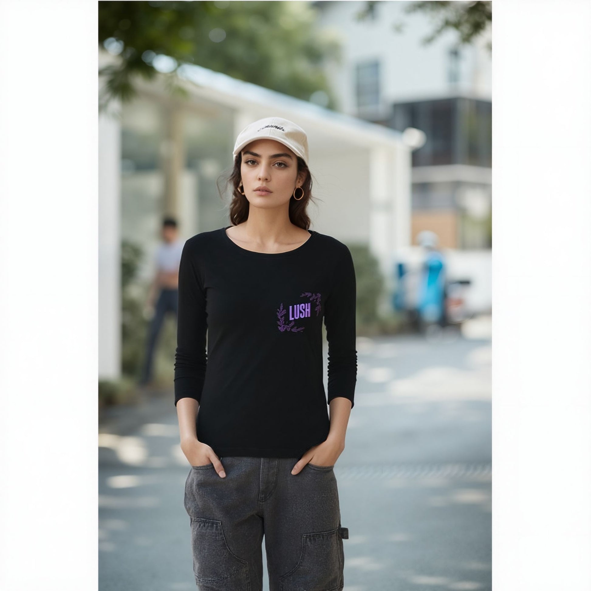 Stay effortlessly stylish with this Black Lush Long Sleeve T-Shirt for women, featuring elegant purple print. A must-have for every minimalist wardrobe.