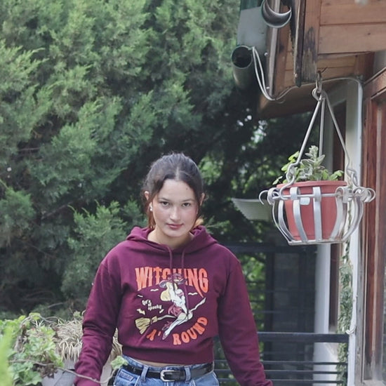 Unleash your edgy, playful side with the LushLounge Maroon Cropped Hoodie, crafted from 100% pure cotton for unmatched comfort. Featuring a bold "Witching Around" retro graphic.