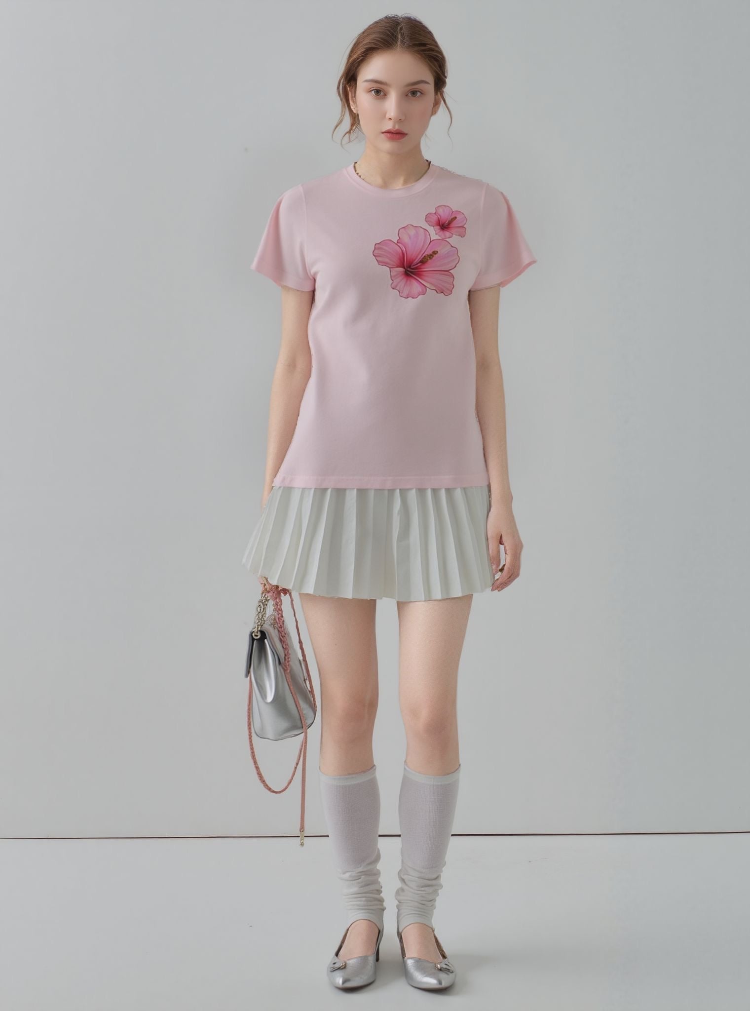 A soft pink t-shirt featuring elegant hibiscus floral embroidery that adds a fresh, feminine touch. Made from a breathable cotton blend for all-day comfort and effortless casual style.