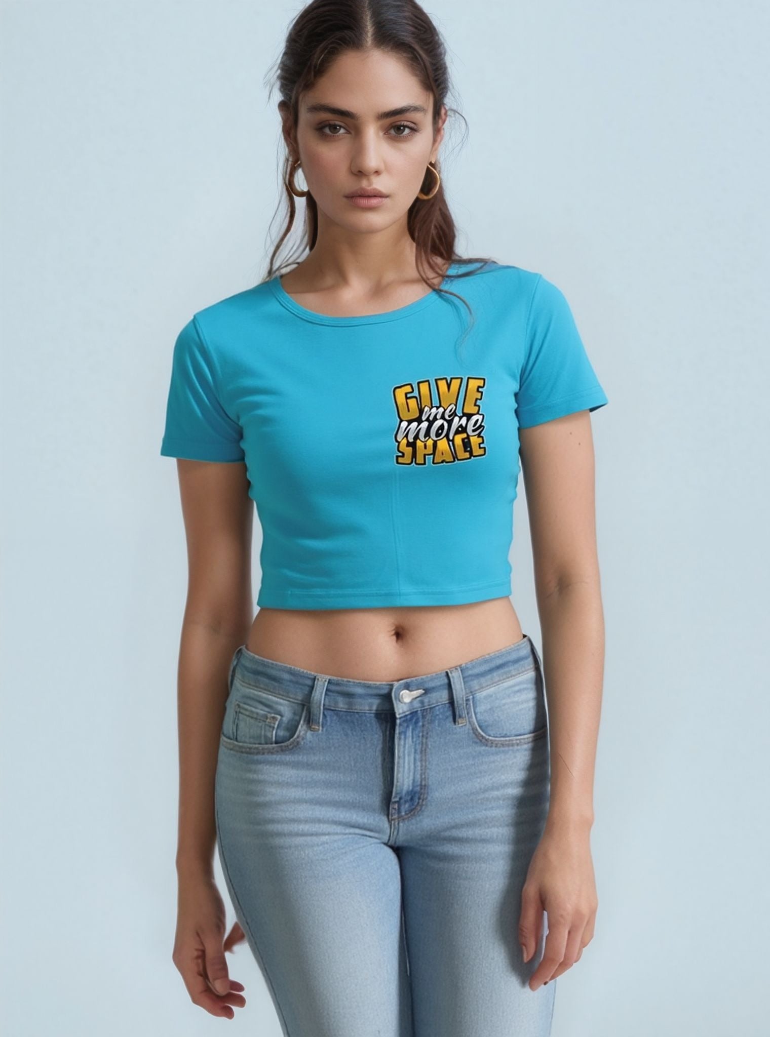 Make a bold statement with this vibrant sky-blue crop top featuring a striking "Give Me More Space" graphic. Crafted from pure cotton, it’s soft, breathable, and made to turn heads in your everyday wardrobe.